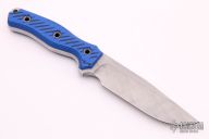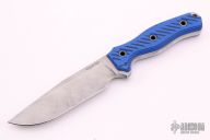 This Mega Ratmandu by Swamp Rat Knives features an Artic Cerakote clip point blade with a deep hollow grind, .355" blade stock and 1.378" blade depth, full tang construction. The handle has black/blue G-10 scales with a lanyard hole at the butt. New from maker.