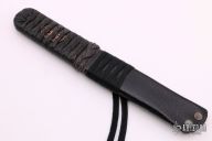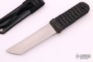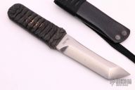 This Strongboy by Phill Hartsfield has a chisel ground tanto blade with a swedge and a black cord wrapped handle, .246" stock and 1.272" depth, hidden tang construction. Original sheath. Fine example of Phill Sr.'s work. Excellent condition.