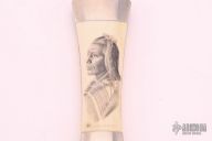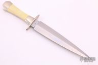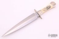 This Dagger by Jess Horn features a hand rub satin finished double edged blade with .177" blade stock and 1.316" blade depth, hidden tang construction. The handle has pinched nickel silver guard and bolsters, scrimshawed mammoth ivory scales, the scale is marked "N79 Antoine Moise - FLATHEAD". Marked "001" on the ricasso. Excellent condition.