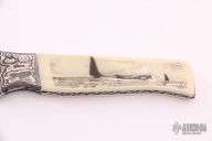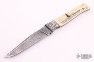 This Hunter from Wayne Valachovic features a Damascus clip point blade with swedge and file worked spine, .140" blade stock and .906" blade depth, full tapered tang construction. The handle has dovetailed Damascus bolsters, walrus ivory scales with scrimshaw of killer whales, fileworked stainless steel liners and tang. Comes with a zippered case. Excellent condition.