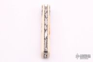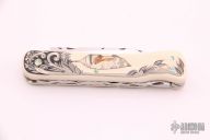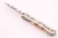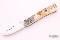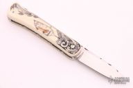 This Lockback folder by Gene Baskett features a hand rubbed satin finish blade with filework along the blade spine and a nail nick. The handle has scrimshawed mammoth ivory scales with abalone inlays, fileworked nickel silver liners, fileworked stainless steel backspacer. Scrimshaw is marked "Garbo-89". Excellent condition.