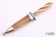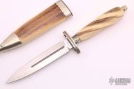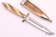 This Dagger by Lee Ferguson features a hand rub satin finished double-edged blade with fullers, .128" blade stock and .944" blade depth, hidden tang construction. The handle has a nickel silver guard and abalone guard with cut out hearts, spiral fluted mammoth ivory grip with twisted wire inlays, nickel silver butt with abalone inlay. Comes with a nickel silver and mammoth ivory scabbard. Excellent condition. #245 on the blade. Comes with a zippered case.