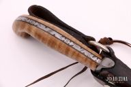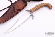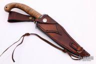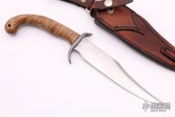 This custom fixed blade is 1 of only 2 made. Hand rubbed satin finish blade with a sharpened top edge, fileworked spine, .183" blade stock and 1.275" blade depth, full tang construction. The handle has a steel double guard, curly maple scales with black liners, fileworked tang. Includes a brown leather sheath. Rustic looking hand forged knife. Has some scratches, excellent condition otherwise.