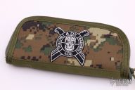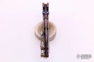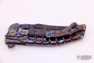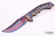 This stunning folder from South African maker Andre de Villiers is a great example of art and function. The Scavenger's trailing point blade is Bertie Rietveld's Dragonskin Damascus with dual anodized titanium thumbstuds, notched thumbrest, and flipper. The handle has a skeletonized integral mokuti frame with matching tip up clip. The action is smooth, lockup is secure, the feel is light and agile. Condition is excellent. Comes with zippered case.