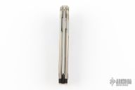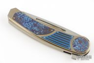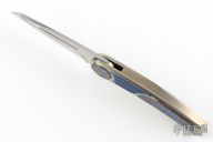 This knife by Mario Peddiu features a hand rub satin finished blade with thumbhole and flipper. The handle has a satin finished titanium frame and backspacer with mokuti and anodized titanium overlays, single titanium liner. Nice detent, lockup and blade seating, rides on bearings. Comes with a zippered case.