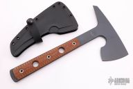This Little Bird by RMJ Tactical features a 3" cutting edge and a 3" spike. Made from a single piece of .276" steel. The handle has textured brown canvas micarta scales. Well-balanced, excellent feel in hand. Comes with kydex sheath. Has a few light scuffs, otherwise excellent condition.