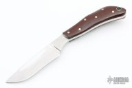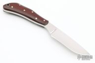 This Utility Boot Knife by Jody Samson features a mirror finished blade with a notched thumbrest, .151" blade thickness and .903" blade depth, full tang construction. The handle has maroon linen micarta scales with nickel silver pins and a lanyard hole. Great feel in the hand. Has a few very light scratches, otherwise excellent condition. Comes with a zippered case.