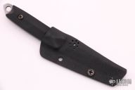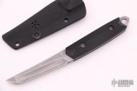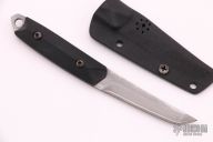 This small fixed blade by Kiku Matsuda features an up swept San Mai Damascus blade with .101" blade stock and .660" blade depth, full tang construction. The handle black G-10. There is a small lanyard hole towards the butt of the handle. Includes a kydex sheath. Excellent Condition.
