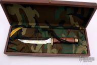 This knife is issued as a proud tribute to honor the Americans who served in the United States Marine Corps in Vietnam. It is serial numbered: 0020 In a strictly limited edition of 2,500 worldwide. This knife is one in a series of four in the Vietnam War fighting knife collection, one for each branch of the military service. This is to further certify that the crossguard, butt, topnut, and blade design patterns are richly plated with 24-karat gold. Made by the Murphy Combat Knife company and issued by The American Historical Foundation. 1142 West Grace Street, Richmond, Virginia 23220. Knife comes in its own wooden case with camouflage lining. Case has some storage scuffs. Excellent condition.