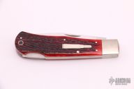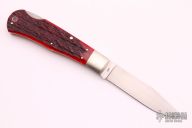 This Remington Replica Fullsize by Jess Horn features a hand rub satin finished clip point blade with nail nick, has a rounded blade spin on the clip. The handle has satin finished nickel silver bolsters and liners, red jigged bone scales, nickel silver bullet escutcheon. Flush lockup and nice blade seating. Comes with a leather zippered case. #161on blade. Has a few light scratches, otherwise excellent condition.