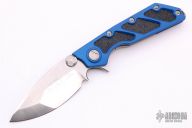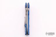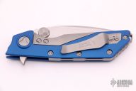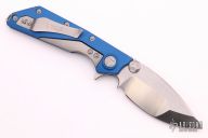 This DOC framelock flipper is a collaboration between A. Marfione and M. Strider, their names are on the clip. The blade is satin with a standard edge, dual thumb-studs, flipper and a notched thumbrest. The handle is blue aluminum with non-slip inserts, and a bead blast stainless steel clip, tip up carry. Comes with original box and papers. Dated 09/2015 and serial number 4460. Excellent condition.