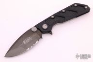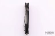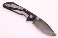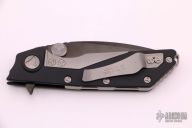 This DOC Framelock Flipper is a collaboration between A. Marfione and M. Strider, their names are on the clip. The blade is black with a partially serrated edge, dual thumb-studs, flipper and a notched thumbrest. The handle is black aluminum with non-slip inserts, and a stainless steel clip, tip up carry. Comes with original box and papers. Dated 03/2015 and serial number 2354. Excellent condition.