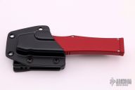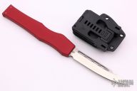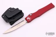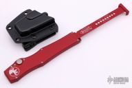 This Halo V OTF automatic has a satin finished blade with a standard edge. Red aluminum handle. Comes with original box, papers and kydex sheath with TekLok. Dated 11/2014 and S/N 07841. Excellent condition.