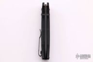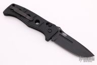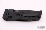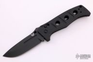 This Adamas by Benchmade is a Shane Sibert design, it has a black blade with dual thumbstuds, fullers and notched thumbrest. The handle has black G-10 scales, black stainless steel liners and tip up clip. Nice lockup and blade seating. Excellent condition. Comes with original box, sheath and papers.
