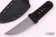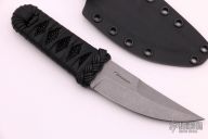 This 4" Kwaiken from Ben Tendick of B.R.T. Bladeworks features a bead blasted kwaiken style blade with swedges. .164" Blade stock 1.295" Blade Depth. The handle is comprised of a Turk's head bolsters and epoxy soaked tsuka wrap over ray skin and a hammered titanium menuki. Includes kydex sheath and COA. Excellent condition.