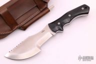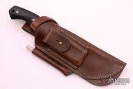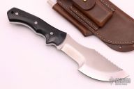 This WSK by Juergen Schanz features a satin finished blade with sawteeth on blade spine, full tang construction with .250" blade stock and 2.563" blade depth. The handle has black linen micarta scales with a lanyard hole at the butt. Includes a brown leather sheath with belt loop and sharpening rod. Excellent condition.