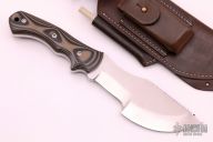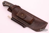 This WSK by Juergen Schanz features a satin finished blade with sawteeth on blade spine, full tang construction with .250" blade stock and 2.563" blade depth. The handle has black/brown G-10 scales with a lanyard hole at the butt. Includes a brown leather sheath with belt loop and sharpening rod. Excellent condition.