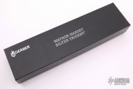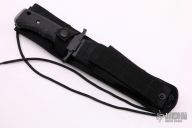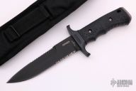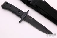 "The Silver Trident is more than a symbol of America's top Special Ops personnel. It's living proof that guys who handle our nation's nastier chores will go through whatever kind of hell is necessary, so long as they have the best gear. The Silver Trident has the most technically advanced handle ever engineered on a combat knife. It's resistant to heat, UV light and chemicals. The brainchild of William Harsey, Jr. and Chief Watson - a founding member of Navy Seal Team 2 - the handle is a co-mold of two versions of the material called Hytrel. Inside, there's a rock-hard version for strength. Outside, there's the soft, textured version for extreme grip control. Use the stainless steel pommel as a hammer. The double-edged clip point blade is 154C stainless steel, heat-treated to achieve a hardness rating of HRC 59-61. That means you get excellent edge retention, strength and flexibility. The non-reflective black blade limits glare and corrosion." Black coated partially serrated double edged blade. 1/4" blade stock and 1 1/4" blade depth, hidden tang construction. Handle is black composite with stainless steel butt cap. Comes with black nylon tactical sheath and the original box. Excellent Condition.