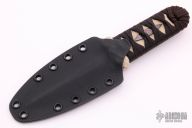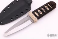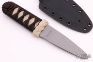 This Bootken by Ben Tendick features a chisel ground dagger style blade with a hidden tang construction.  .178" Blade Stock.  1.194" Blade Depth.  The handle features a Tsuka Ito wrap and a hammered copper menuki.  Includes a kydex sheath and COA.  New from Maker.