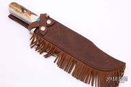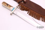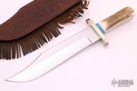This Bowie by Buck Knives features a mirror polished clip point blade with a false top edge, fileworked spine, .176" blade stock and 1.998" blade depth, full tang construction. The handle is comprised of a nickel silver guard and stag scales with a carved stag eagle inlay and turquoise and nickel silver spacers. Includes a brown leather sheath with belt loop. Numbered 037/250 on blade. Has a few light scratches, otherwise excellent condition.