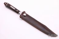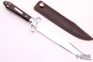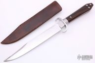 This Helles Bell Bowie from Bill Bagwell features a mirror polished blade with sharpened top edge, .282" blade stock and 1.309" blade depth, hidden tang construction. The handle is comprised of a steel guard and spacer with a cocobolo handle and stainless steel hardware over hidden tang construction. Includes original leather sheath and a zippered case. Has a few light scratches, otherwise excellent condition.