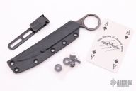 The Bastinelli Spade provides covert defense with a slim, lightweight scalpel design. .152" Blade Stock. .715" Blade Depth. It has a razor sharp scalpel style blade with partial serrations and a karambit style finger hole for improved grip and blade control. The spade features a custom kydex sheath. New from maker.