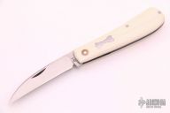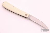 This custom slip joint from David Taber features a hand rub satin finished wharncliffe blade with a nail nick. The handle has walrus ivory covers with stainless steel liners, escutcheon and spring. Flush in the closed, half stop and open position. New condition.