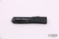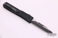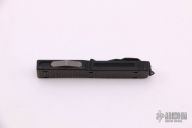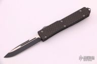 This UTX-70 OTF automatic by Microtech features a two-tone black blade with a standard edge and fullers. The handle has a black aluminum frame with a carbon fiber top, tip down black stainless steel clip. Excellent condition. Comes with original box, sheath and papers. Dated 07/2004 and #1488