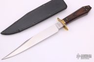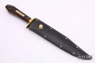 This is a discontinued Bill Bagwell designed Gambler Bowie, made by Ontario Knife Company. Features a satin finished clip point blade with sharpened top edge, .310" blade stock and 1.264" blade depth, hidden tang construction. The handle has a brass guard/collar/studs, and a dymondwood grip. Includes all original box and black leather sheath. Excellent condition.