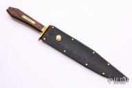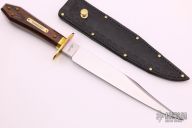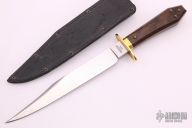 This is a discontinued Bill Bagwell designed Gambler Bowie, made by Ontario Knife Company. Features a satin finished clip point blade with sharpened top edge, .310" blade stock and 1.264" blade depth, hidden tang construction. The handle has a brass guard/collar/studs, and a dymondwood grip. Includes all original box and black leather sheath. Excellent condition.