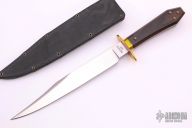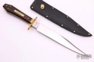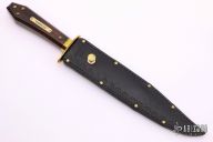 This is a discontinued Bill Bagwell designed Gambler Bowie, made by Ontario Knife Company. Features a satin finished clip point blade with sharpened top edge, .310" blade stock and 1.264" blade depth, hidden tang construction. The handle has a brass guard/collar/studs, and a dymondwood grip. Includes all original box and black leather sheath. Excellent condition.