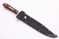 This is a discontinued Bill Bagwell designed Bowie, made by Ontario Knife, features a mirror finished blade with sharpened top edge, .305" blade stock and 1.399" blade depth, hidden tang construction. The handle has a stainless steel guard, wooden coffin shaped handle with nameplate. Comes with original box and black leather sheath. Excellent condition.