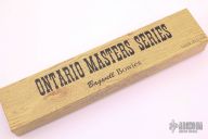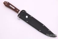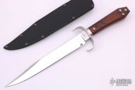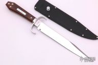 This is a discontinued Bill Bagwell designed Bowie, made by Ontario Knife, features a mirror finished blade with sharpened top edge, .305" blade stock and 1.337899" blade depth, hidden tang construction. The handle has a stainless steel guard, wooden coffin shaped handle with nameplate. Comes with original box and black leather sheath. Excellent condition.