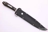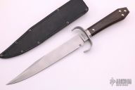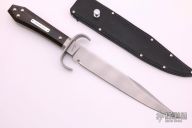 This is a discontinued Bill Bagwell designed Fortress Bowie, made by Ontario Knife, features a bead blasted blade with sharpened top edge, .308" blade stock and 1.348" blade depth, hidden tang construction. The handle has a bead blasted stainless steel guard, wooden coffin shaped handle with nameplate. Black leather sheath. Excellent condition. Comes with original box.