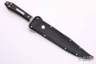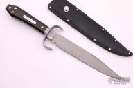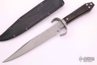 This is a discontinued Bill Bagwell designed Fortress Bowie, made by Ontario Knife, features a bead blasted blade with sharpened top edge, .308" blade stock and 1.348" blade depth, hidden tang construction. The handle has a bead blasted stainless steel guard, wooden coffin shaped handle with nameplate. Black leather sheath. Excellent condition. Comes with original box.