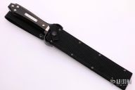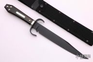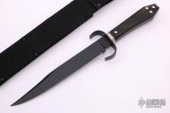 This is a discontinued Bill Bagwell designed Bowie, made by Ontario Knife, features a black coated blade with false top edge, .313" blade stock and 1.369" blade depth, hidden tang construction. The handle has a black stainless steel guard, wooden coffin shaped handle with nameplate. Comes with original box and black nylon sheath. Excellent condition.