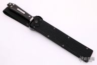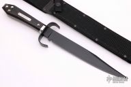 This is a discontinued Bill Bagwell designed Bowie, made by Ontario Knife, features a black coated blade with false top edge, .313" blade stock and 1.369" blade depth, hidden tang construction. The handle has a black stainless steel guard, wooden coffin shaped handle with nameplate. Comes with original box and black nylon sheath. Excellent condition.