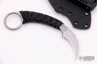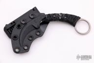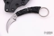 This PiKa is a Doug Marcaida design produced by Bastinelli Knives, it features a chisel ground stonewashed hawkbill blade with swedge, .150" blade stock and .678" blade depth, full tang construction. The handle has black wrap over black cord wrap with bronze menuki. Comes with kydex sheath with Dots belt clip. Comes with a padded zippered case. New from maker.