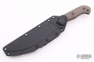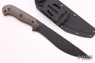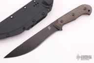 The Silence by Bastinelli Knives features a black blade with a notched thumbrest and a full tang construction. .193" Blade Stock. 1.429" Blade Depth. The handle features green micarta scales. Includes a kydex sheath with a tech-lock. New from maker.
