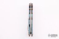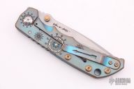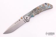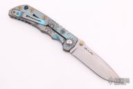 This framelock folder by Spartan Blades features a stonewash finished drop point S45VN blade with dual thumbstuds and a notched thumbrest. The handle has a custom engraved and anodized titanium frame with tip up titanium clip. Handle is laser engraved. Has nice detent, lockup, and blade seating. Comes with original box. Excellent condition.