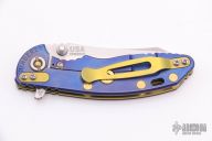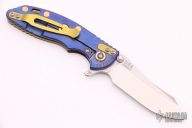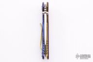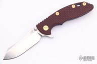 This XM-18 by Rick Hinderer features a stonewash finished blade with notched thumbrest and flipper. The handle has a red linen micarta front scale, anodized titanium frame, brass hardware, and a tip up or down reversible anodized titanium clip and filler tab, lanyard hole at the butt. Excellent condition. Comes with original box and extra pivot hardware.