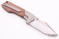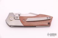 This knife was designed by Michael Burch and produced by Reate Knives.  The knife features a satin finished blade with dual thumb studs and a notched thumb rest.  The handle features bead blasted bolsters, liners and a matching tip up pocket clip.  The scales are natural canvas micarta. Nice detent, lock up and blade seating.  Excellent condition.