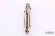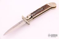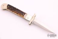 The Guardian by Hubertus Knives features a satin finish blade, nickel silver guard, bolsters, release, and pins, stag scales, and brass liners. Smooth, quick opening. Strong lockup. Scuffs and scratches are visible on the blade and handle otherwise the knife is in excellent condition.