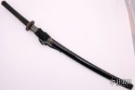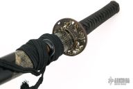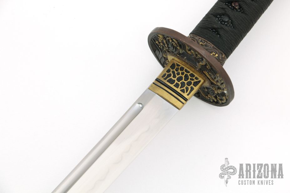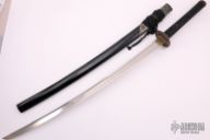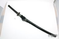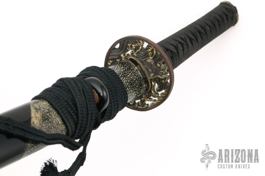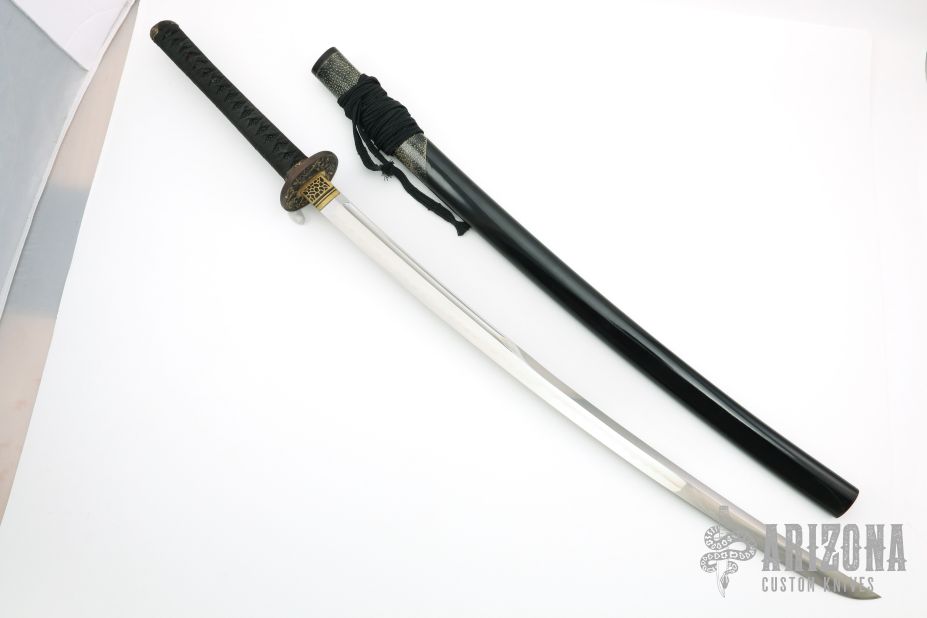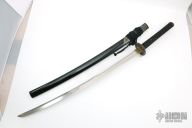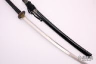This Katana by Huawei features a nicely polished blade with fullers and false top edge, .300" blade stock and 1.261" blade depth, hidden tang construction. The handle has a brass habiki, seppas, tsuba and kashiri, black stingray skin tsuka and black wrapped tsuka ito, has brass menukis. Comes with a black wood and stingray skin saya. Excellent condition.