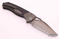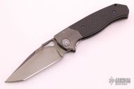 This Revolution scale release D/A from Matt Diskin features a DLC mirror finished tanto blade with thumbhole and checkered thumbrest. The handle has a blackened and orange peel finished and milled titanium frame with carbon fiber scales, Damasteel pivot, tip up blackened titanium clip, and a notched carbon fiber backspacer, stainless steel liner, anodized titanium screws. Nice detent, lockup, action and blade seating. Includes zippered case. Excellent condition.
