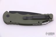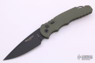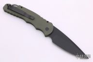 This Tactical Response 4 by Pro-Tech has a black blade with a plain edge, and a green aluminum handle. Black stainless steel clip. Steel glass breaker. Secondary safety switch. Comes with original box, sheath and papers. PR11, serial number 209. Excellent condition.