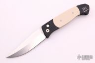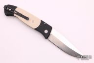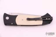 The Brend Auto by Pro-Tech Knives features Walter Brend's famous "Model 1" blade shape in a small package. Coil spring side-opening automatic. It has a satin finished blade and black aluminum handle with ivory micarta inlays, tip up black stainless steel clip. Excellent condition. Comes with original box and papers. PR4 #174