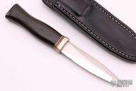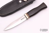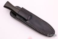 This Vintage Model 24 Guardian by Randall Made Knives features a satin finished double-edged blade with notched finger rests, .125" blade stock and .889" blade depth, hidden tang construction. The handle has a nickel silver guard, micarta grip and (5) red/white/blue spacers. Both edges of the blade are sharpened with 1" of thumb notches. This model was designed in 1978 for use by police, undercover agents and law enforcement personnel for self-protection and as a back-up weapon. Comes with a black leather sheath. Scuffs, scratches and patina is visible on the handle and blade otherwise the knife is in good condition.