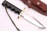 This Model 15 Airman by Randall Made Knives features a clip point blade with a sharpened top edge, .226" stock. 1.261" blade depth. Sharpened top edge, full tang construction. The handle has black linen micarta handle with finger grips and a brass guard. The Model 15 is designed especially for heavy-duty use and to be as nearly indestructible as possible. Comes with a brown leather sheath. Excellent condition.