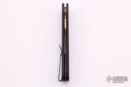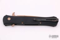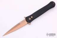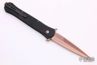 This Large Don by Pro-Tech features a satin rose gold finished blade with false top edge. The handle has a black aluminum handle with black tip up stainless steel clip. Comes with original box and papers. Excellent condition. PR5 #156
